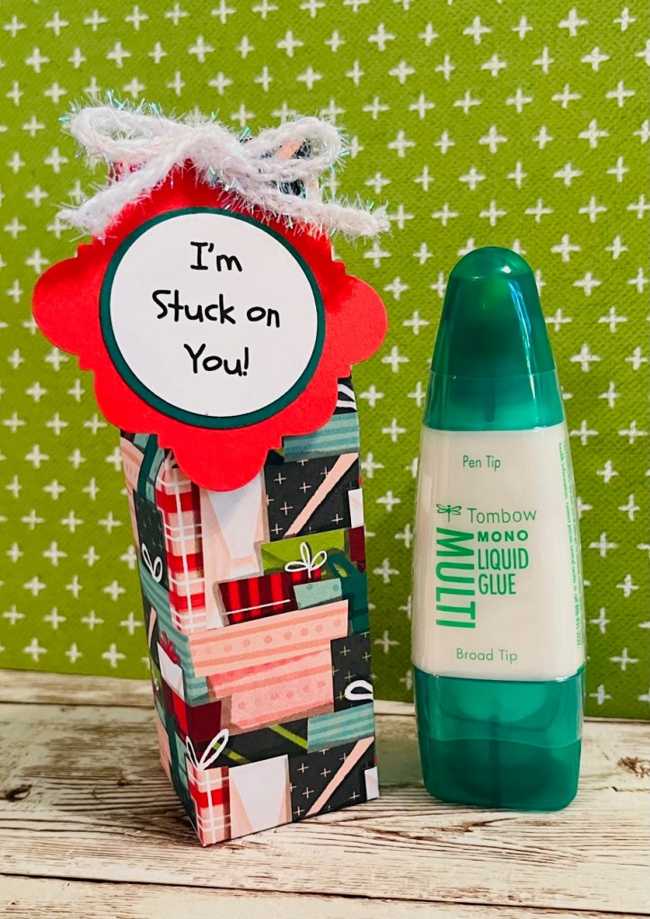 The first video in the series shows you how to make a Small Pinched Top Box! My original box (photo below) was created to specifically hold a bottle of our Multi-Purpose Liquid Glue! This was one of the Pillow Gifts that I gave attendees of my Online Holiday Workshop this past weekend! I created a cute tag saying “I’m stuck on you” – get it?