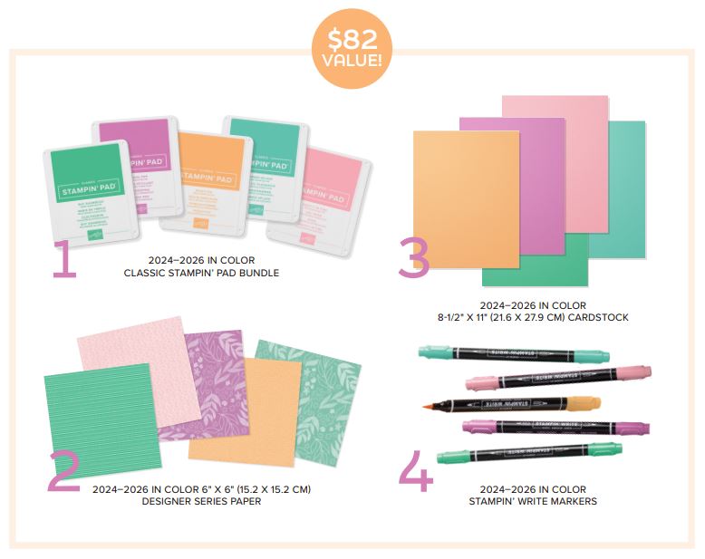 This piece pack contains samples of the 5 new In Colors; Petunia Pop, Summer Splash, Peach Pie, Pretty in Pink, and Shy Shamrock, plus extra items in Basic White! This is your chance to check out the new 2024-2026 In Colors!